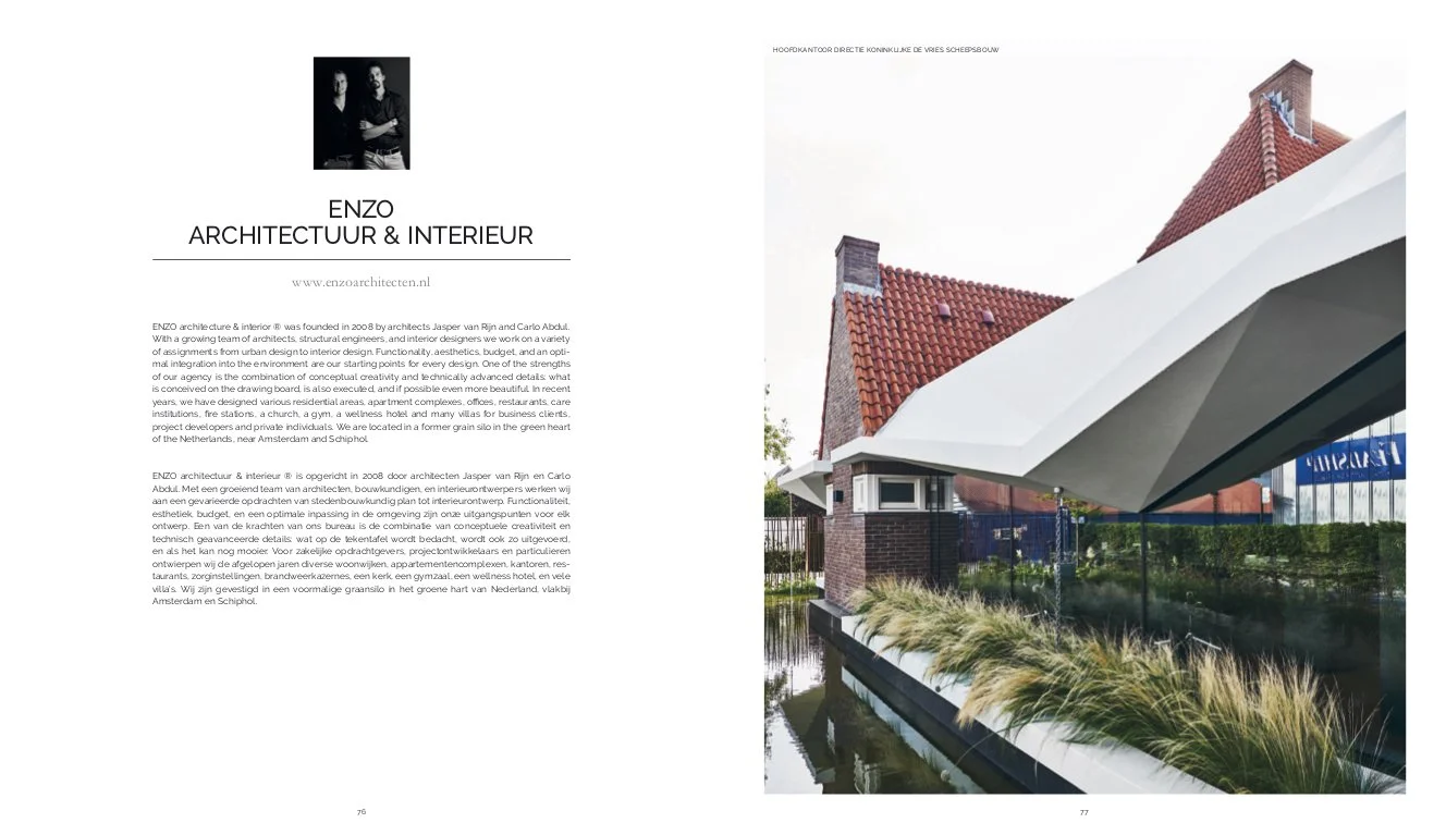 In de nieuwste editie van Dutch Architecture vind je ons project voor het hoofdkantoor van de directie van Koninklijke De Vries Scheepsbouw. Op meer dan 300 pagina’s met toonaangevende Nederlandse architectuur springt dit ontwerp eruit: een krachtig gebouw waarin familiegeschiedenis, vakmanschap en moderne techniek samenkomen. Een schets van de hand van architect Ingo Douwma siert het schutblad.